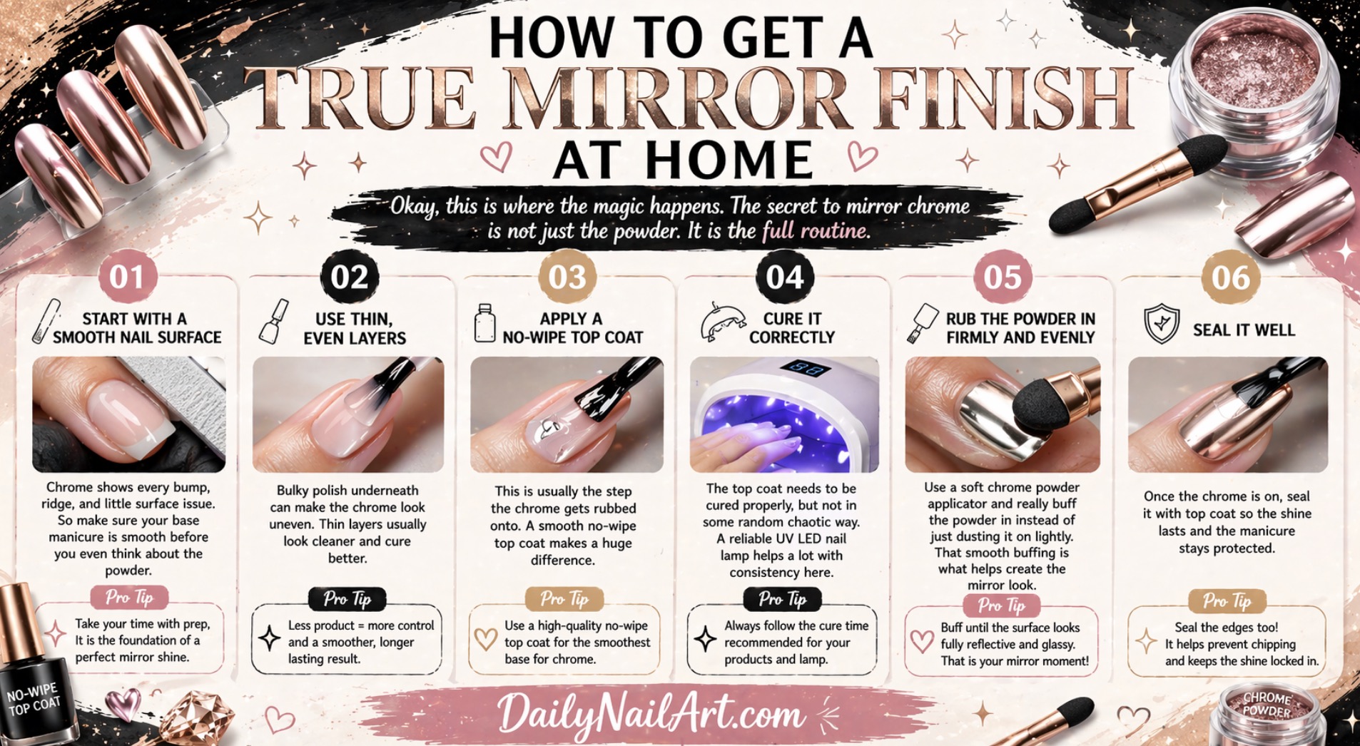 Yes. Chrome nails are actually very doable for beginners once you understand the right order of base, top coat, powder, buffing, and sealing.