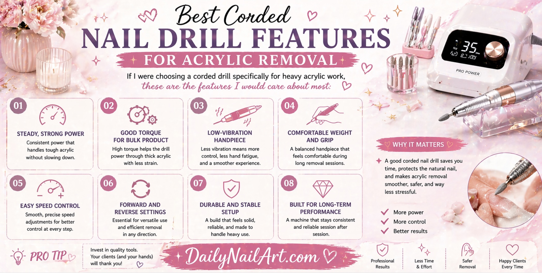 A pro usually wants a drill that can take down acrylic efficiently without feeling like it is struggling or slowing down.