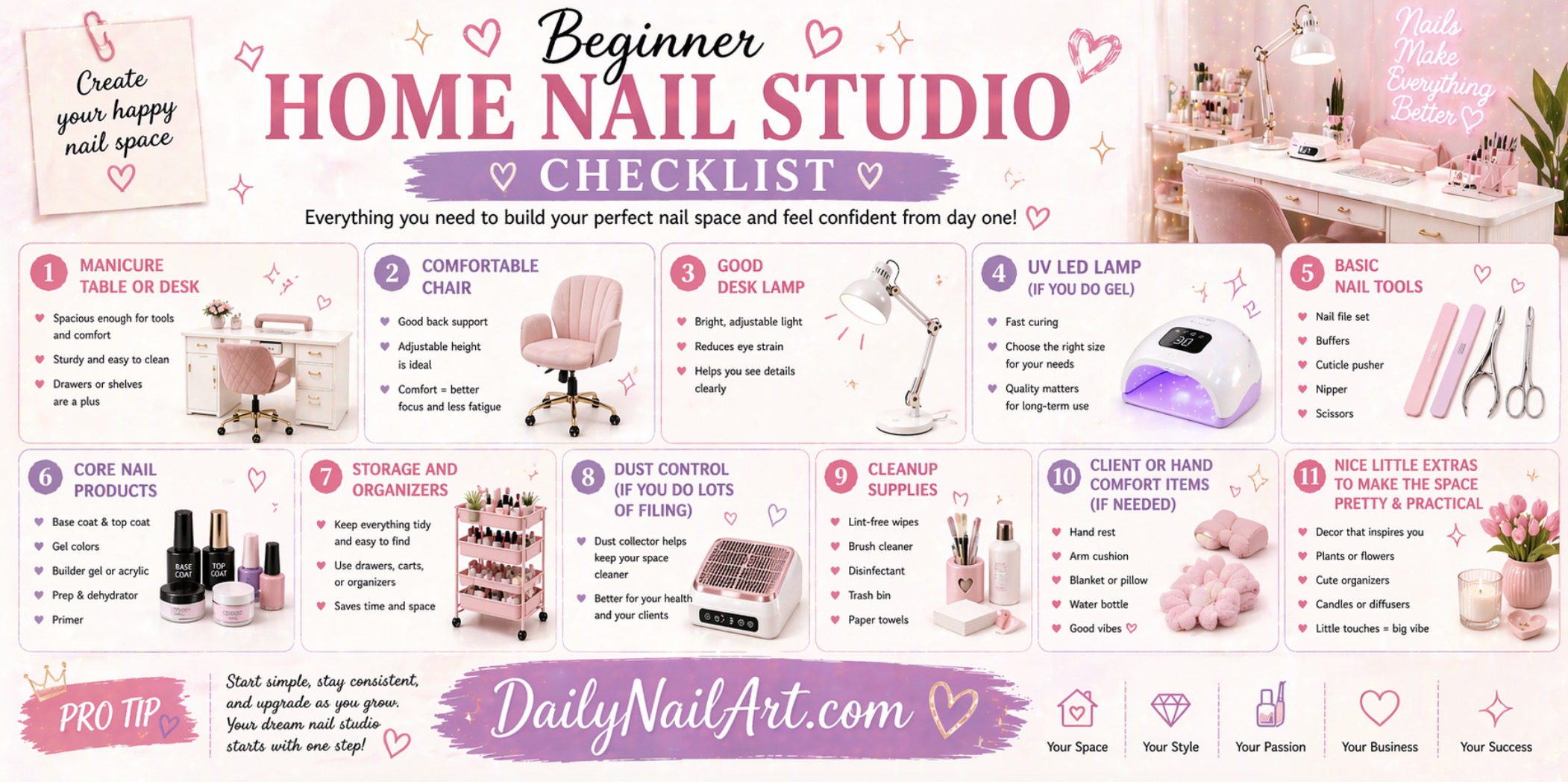 This guide is your beginner-friendly, no-panic, very cute home nail studio setup checklist for beginners. We’re going to walk through the core furniture, lighting, tools, products, storage, and little comfort upgrades that can help your space feel more polished and way less random. Whether you want to do your own nails at home, build content, practice as a beginner nail artist, or slowly work toward a small home nail business, this checklist will help you set up a space that actually works.